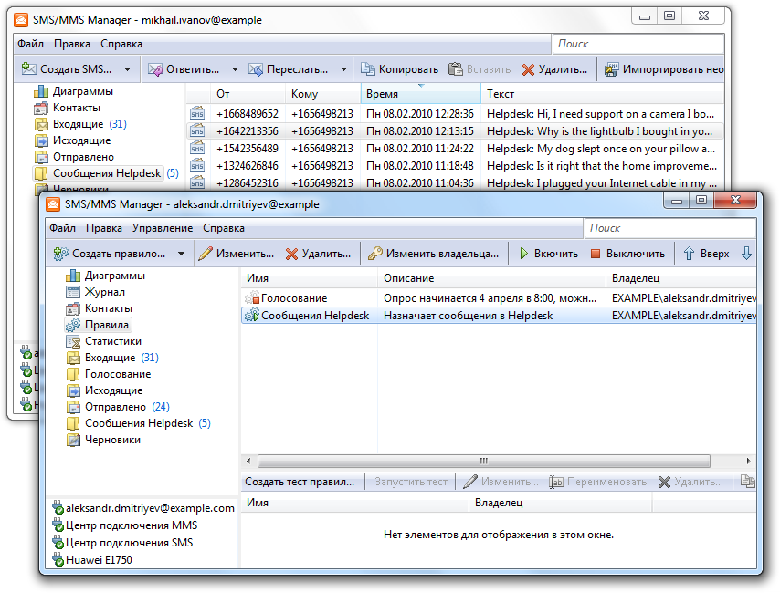 Например, если имеется группа пользователей с названием "Helpdesk операторы" и будет получено сообщение, которое по правилам относится к этой группе, все члены группы, у которых есть SMS/MMS Менеджер, сразу увидят это сообщение на своем экране.
